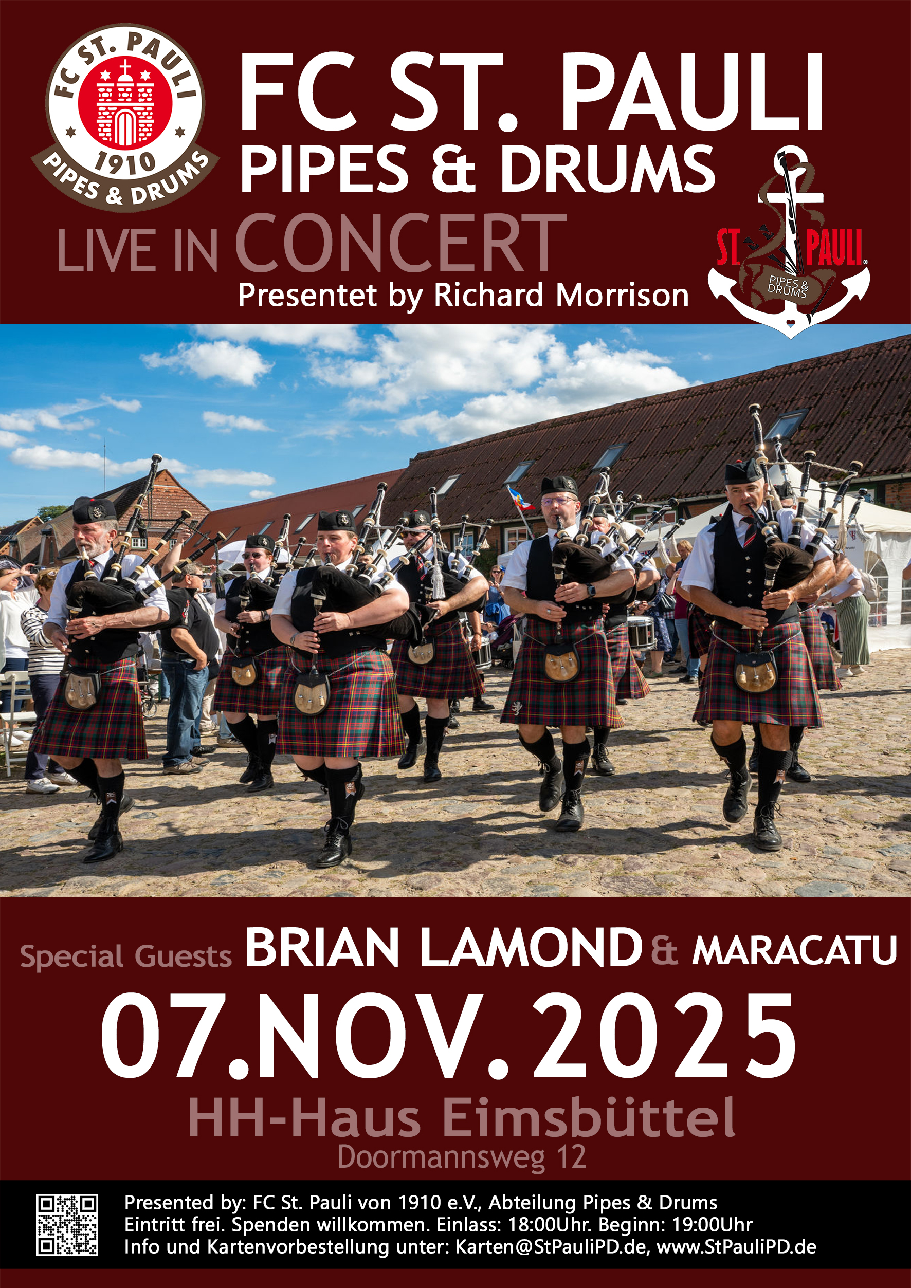 Unsere Band wird 10 Jahre alt. Sie wurde als Betriebssportgruppe der Techniker Krankenkasse gegründet und trat damals noch als „St. Pauli Pipes & Drums“ auf. Inzwischen sind wir bereits seit 8 Jahren eine Abteilung des FCSP. Wir wollen das mit einem Jubiläumskonzert für unsere Mitglieder, Familie, angehörige und interessierte Förderer feiern. Als Gäste für das Konzert haben wir Brian Lamond, als einen der weltbesten Piper und die Gruppe Maracatu, mit ihrer brasilianischen Sambamusik, gewinnen können.